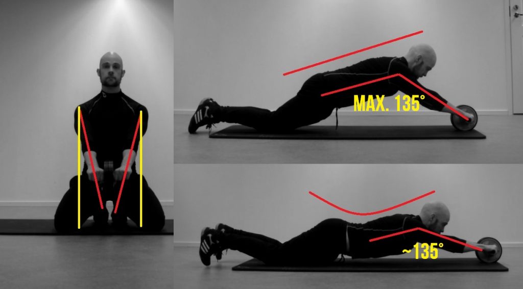 Voimapyörän huono puoli: Vasemmassa kuvassa kuvattuna voimapyörä ja ote voimapyörästä. Voimapyörän kapean oteleveyden seurauksena olkanivelet (punainen viiva) ovat lähennyksessä suhteessa neutraaliasentoon (keltainen viiva). Tämän seurauksena olkanivel voi liikkua maksimissaan 135 asteen koukistuskulmaan harjoitteen aikana (kuva oikealla ylhäällä). Jos harjoitetta viedään pidemmälle (rintakehä viedään lattiaan saakka kiinni), tapahtuu jostain kompensaatio. Kompensaatio tapahtuu tyypillisesti selkärangasta (selkäranka taittuu voimakkaasti ojentuneeseen asentoon), ja pahempana vaihtoehtona olkanivel taittuu ylikoukistukseen (tässä vaiheessa olkanivel ohjautuu passiiviseen asentoon, ja tällä voi olla erityisen tuhoisat seuraukset tässä harjoitteessa). Oikealla alempi kuva kuvaa tätä tilannetta – olkanivelen kulma on sama, vaikka vartalo on lähempänä lattiaa. Älä tee harjoitetta, jos tekeminen näyttää tältä!
