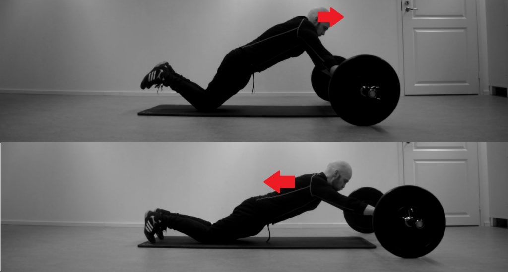 Sitten vain tehdään normaali voimapyöräliike – ainoastaan tällä kertaa olkanivelen luukontakti ei armahda ala-asennossa, eikä keskivartalon asentoa voi helpottaa kompensoimalla. Voit siis huoleti päästää keskivartalon lattiaan saakka kiinni – kunhan hartiaseudun ja keskivartaloalueen lihakset ovat työssä mukana!