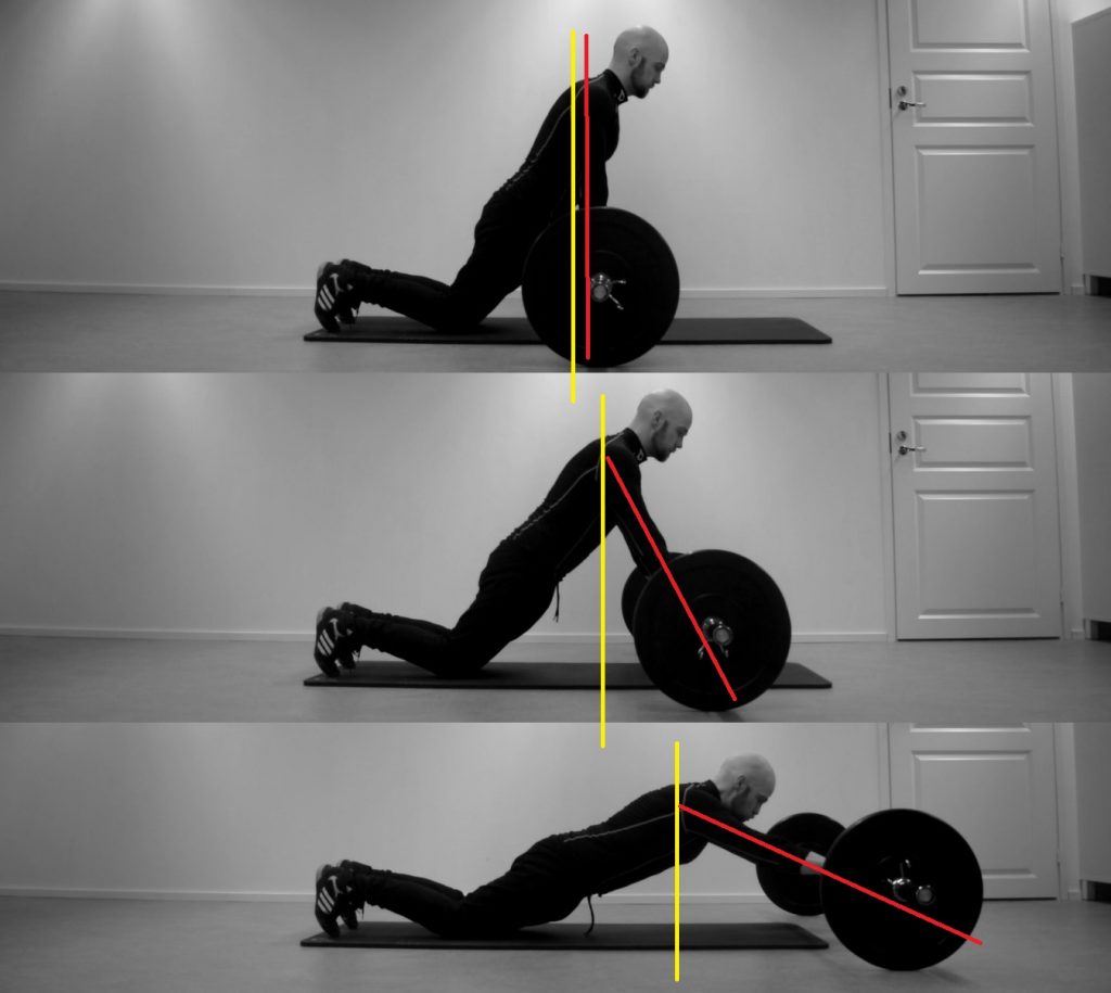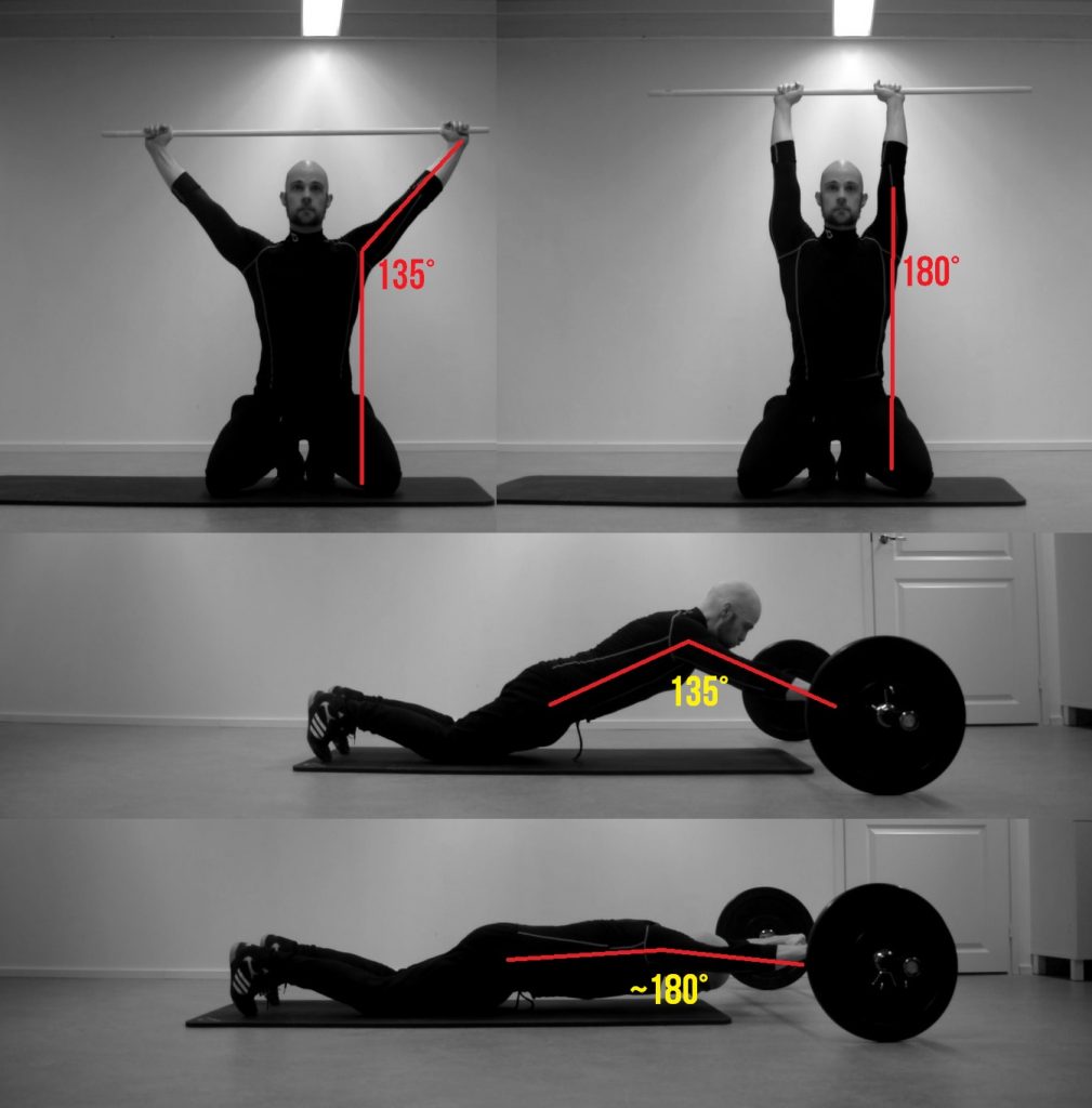 Liikelaajuus: Ylin kuva kuvaa aloitusasentoa, eli olkavarsi (punainen viiva) on pystysuorassa (keltainen viiva). Keskimmäinen kuva kuvaa pientä siirtoa pystysuoran akselin etupuolelle, eli olkavarsi ei ole enää pystysuorassa, vaan olkavarsi on siirtynyt pystysuoran akselin etupuolelle. Voit hyvin lopettaa liikkeen tähän, ja tehdä tässä vaikkapa nautinnollisen 30s pidon! Jos voimat riittävät, voit jatkaa matkaa niin pitkälle kuin kontrolloidusti pääset (alin kuva)! Eli rintakehää ei tarvitse viedä lattiaan saakka – eikä edes saa viedä, jos se ei onnistu kontrolloidusti! Ole tarkkana ja tee tämä harjoite oman kuntotason mukaan! Jos oikeasti haluat kehittyä ja vahvistua, muista olla rehellinen itsellesi – brassailu tulee sitten myöhemmin mukaan, kunhan teet itsestäsi ensin oikeasti vahvan!